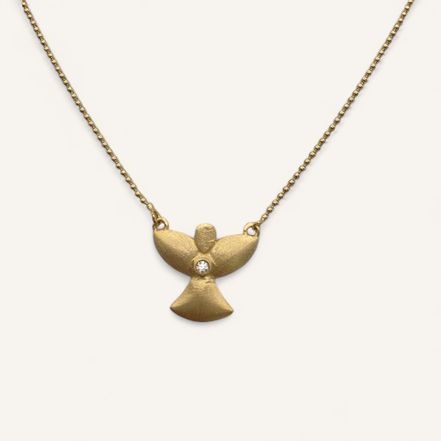 A radiant golden figure with a soft glow and a single crystal at its heart. Light, grace, and quiet strength in one timeless piece.