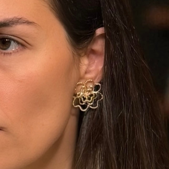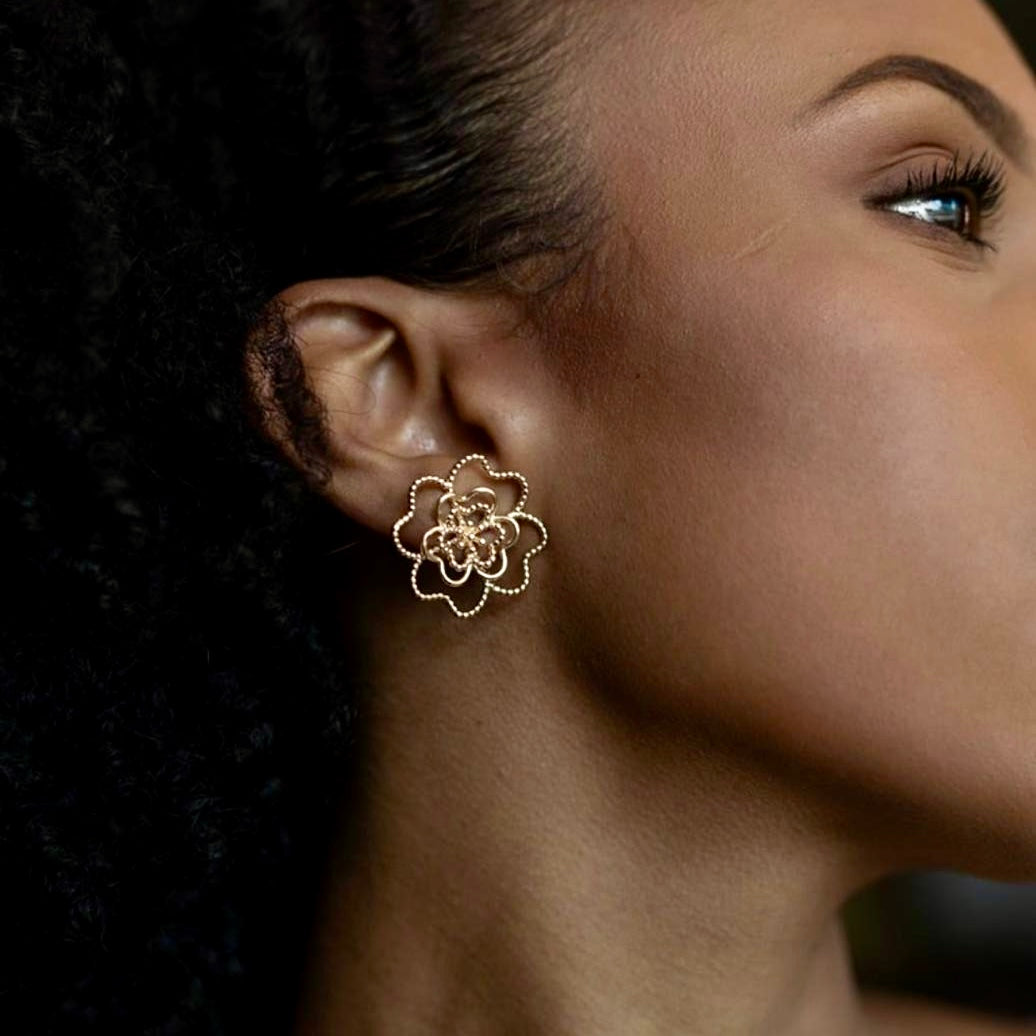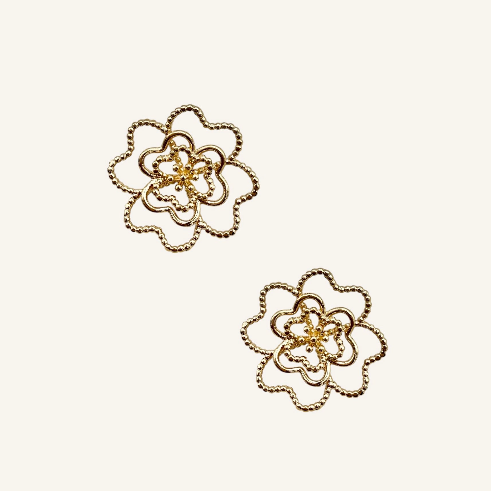 A golden bloom of layered petals radiates timeless elegance in this sculptural stud.