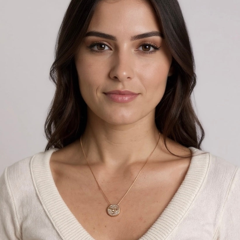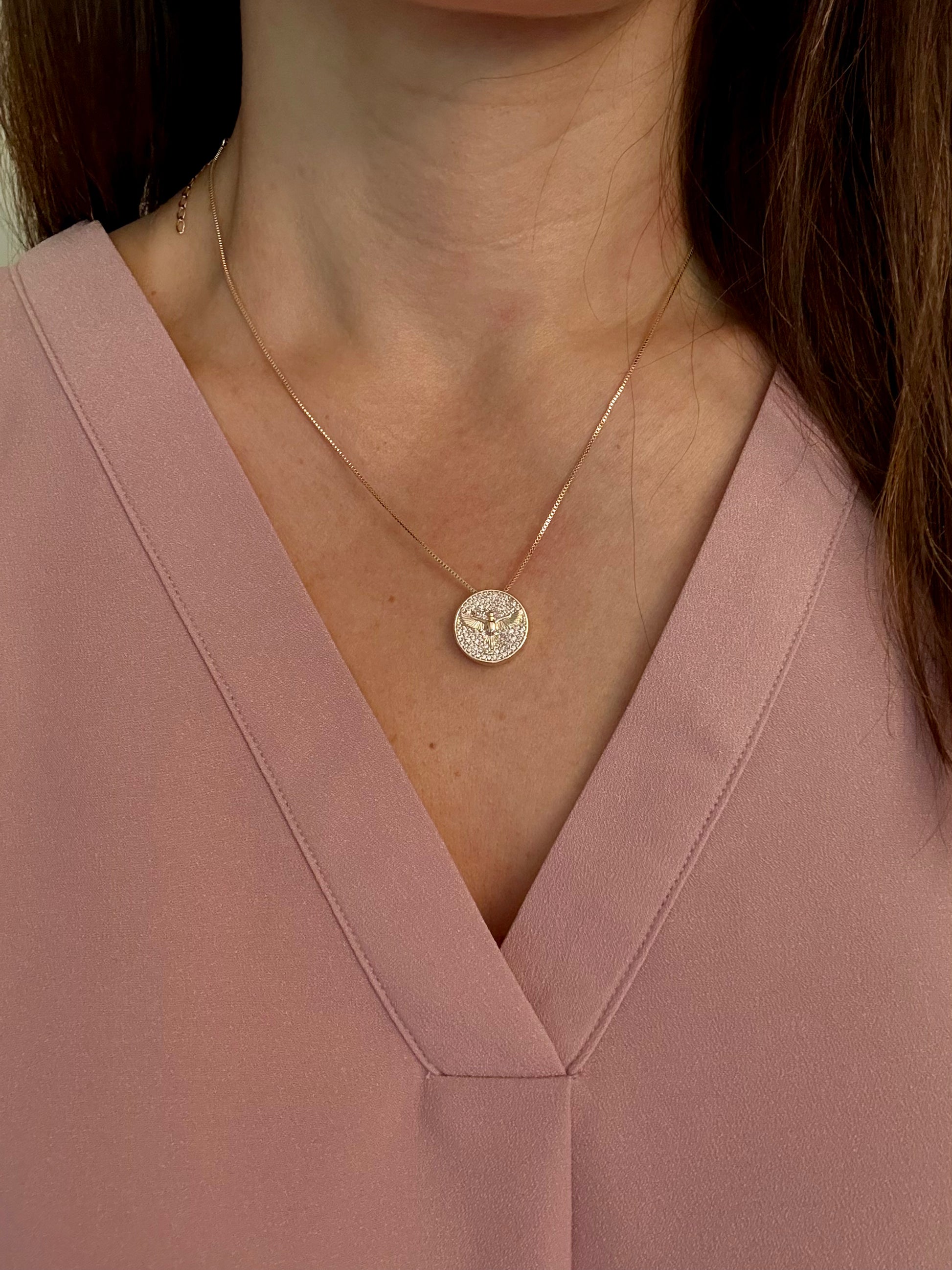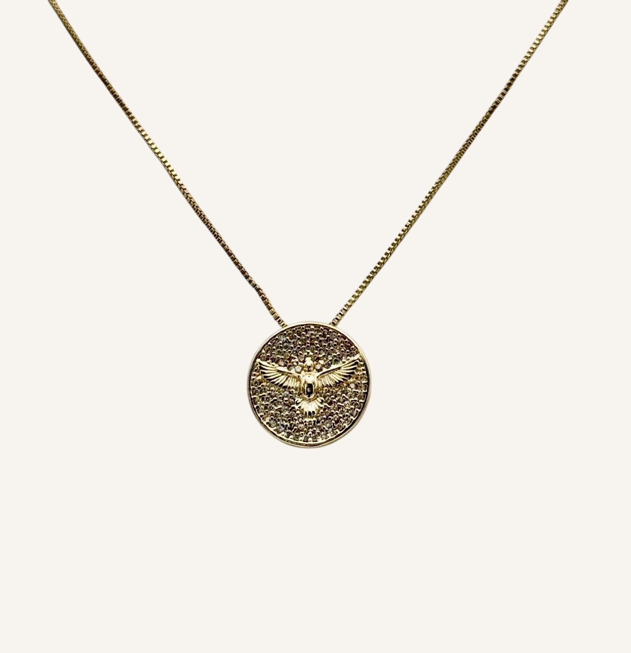 Gold-tone necklace featuring a textured medallion with a raised dove, symbolizing peace, protection, and light.