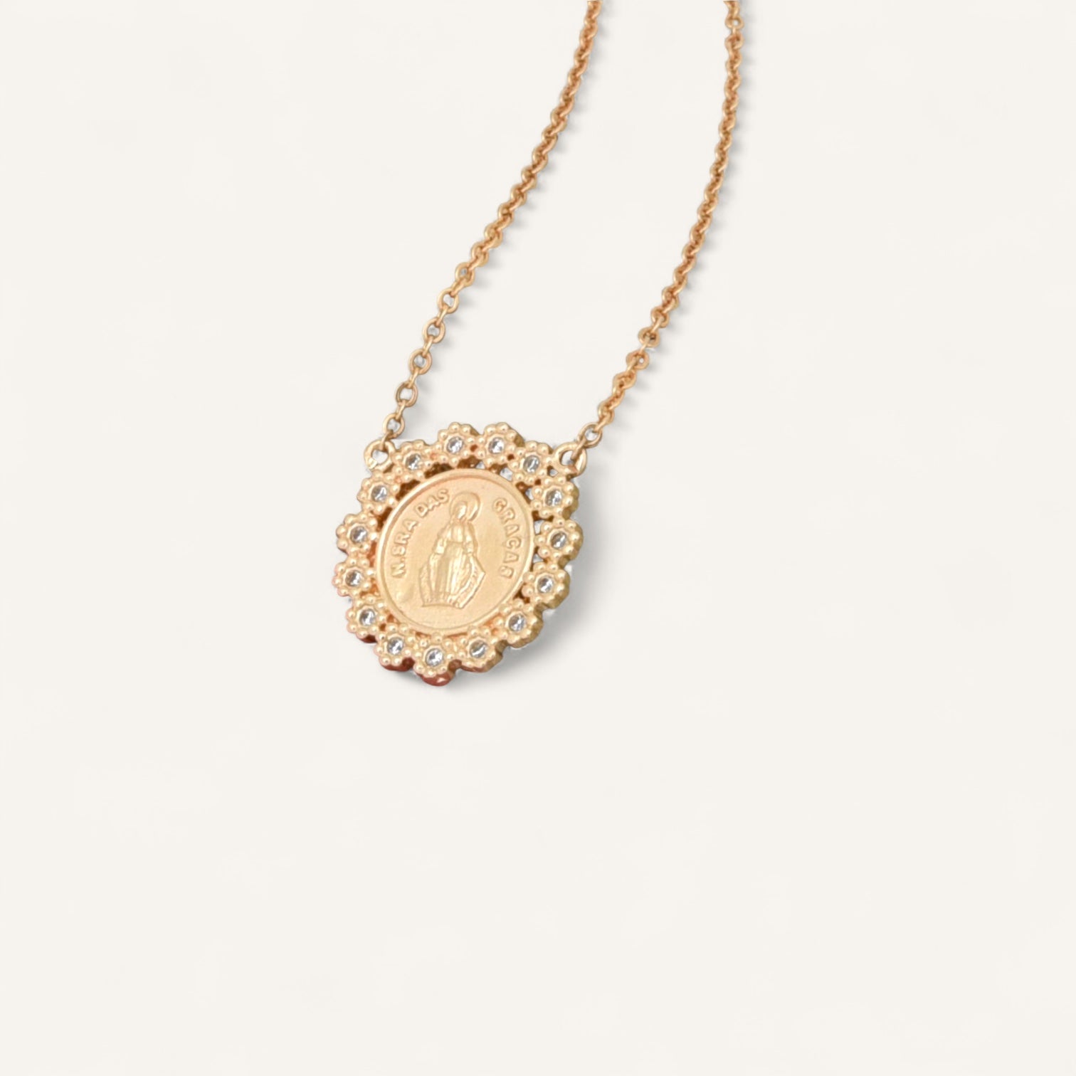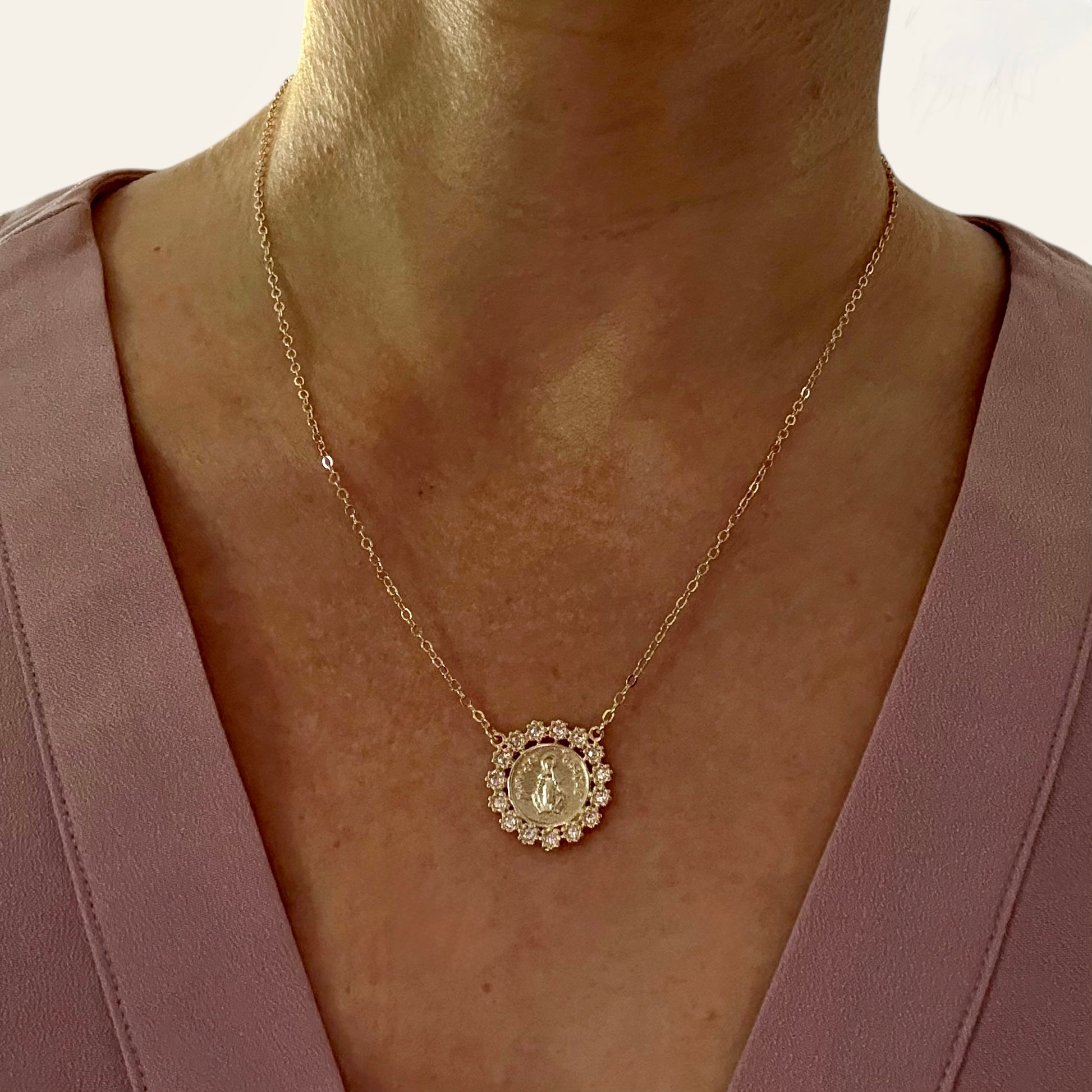 A radiant medallion necklace honoring divine grace, encircled by shimmering stones for a sacred sparkle.
