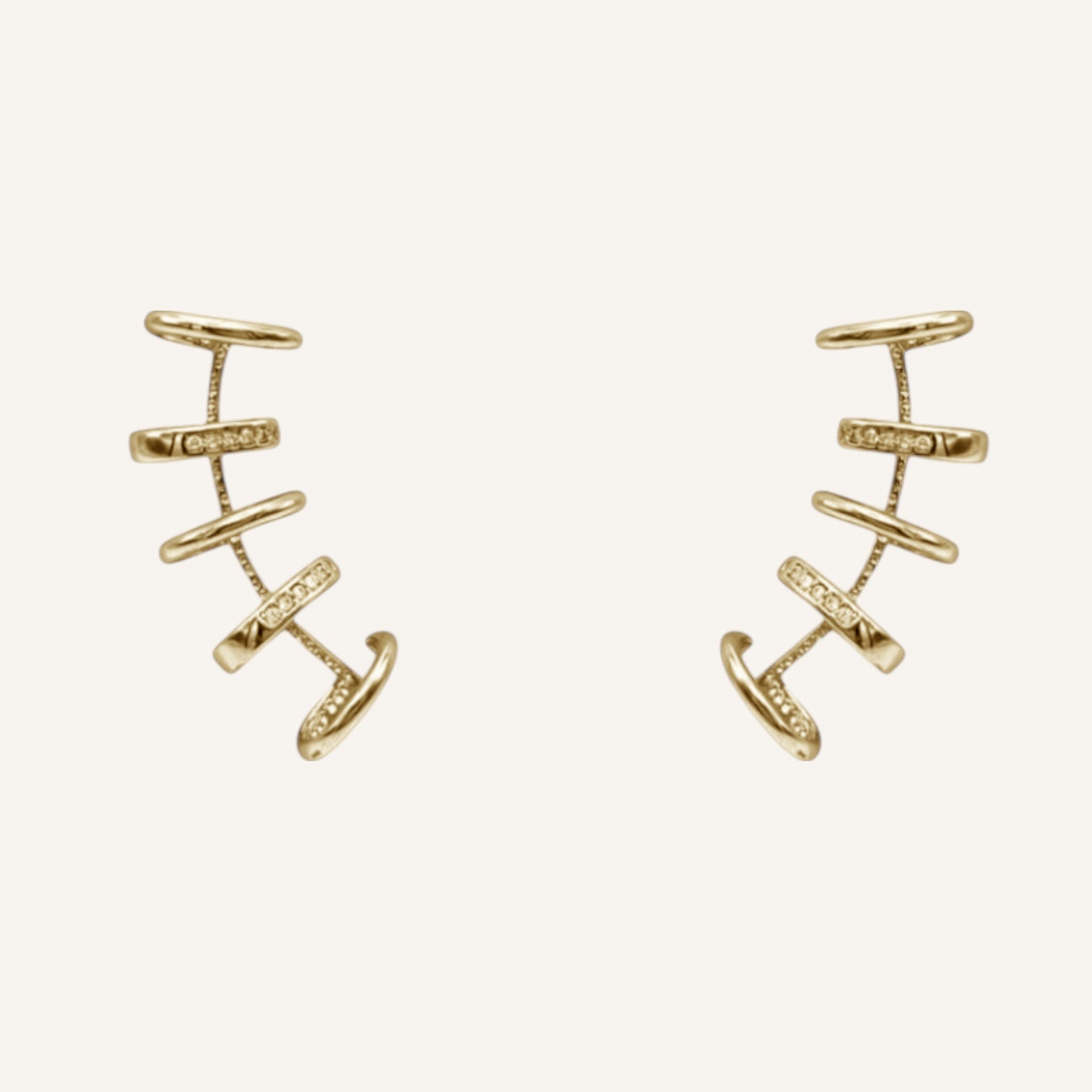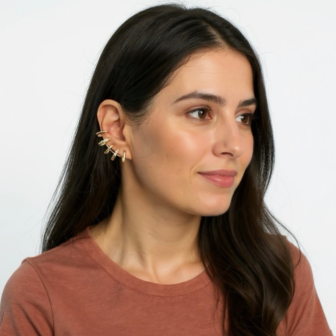 A bold spiral of polished gold, accented with shimmering stones. This ear climber brings edge and elegance in perfect balance.