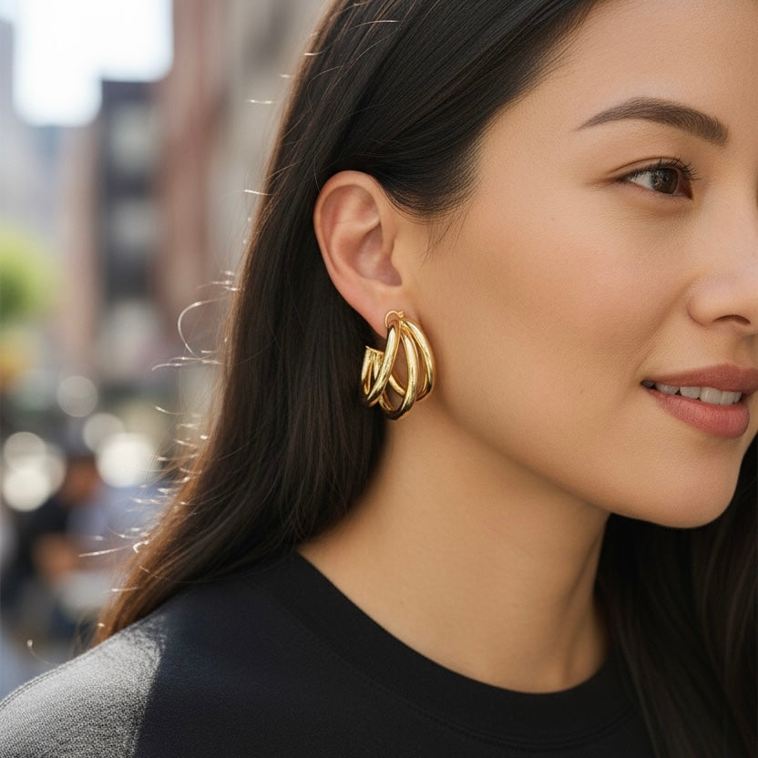 A bold triple-hoop earring in polished gold-tone metal. Sculptural, modern, and effortlessly chic. Wear solo or stacked for extra edge.