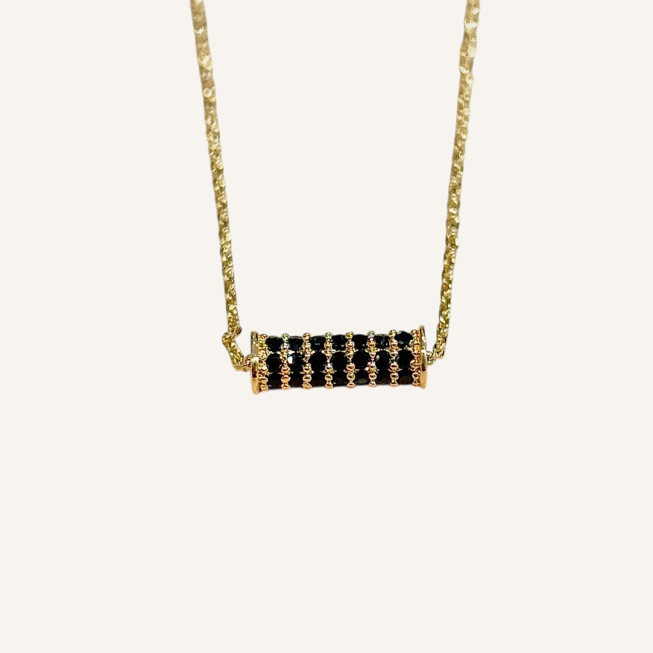 A sleek gold necklace with deep black stones, perfect for a touch of understated elegance.