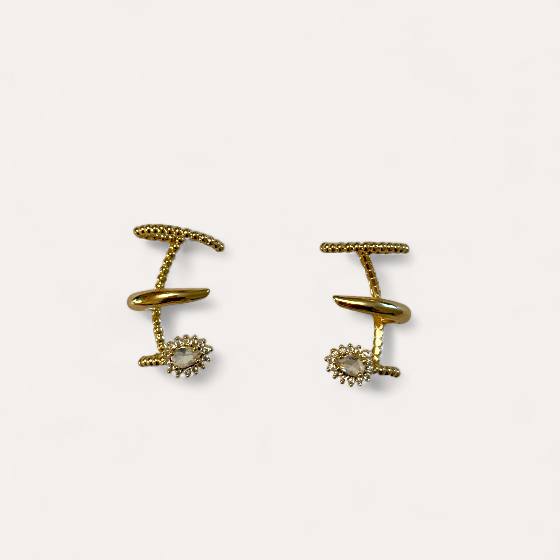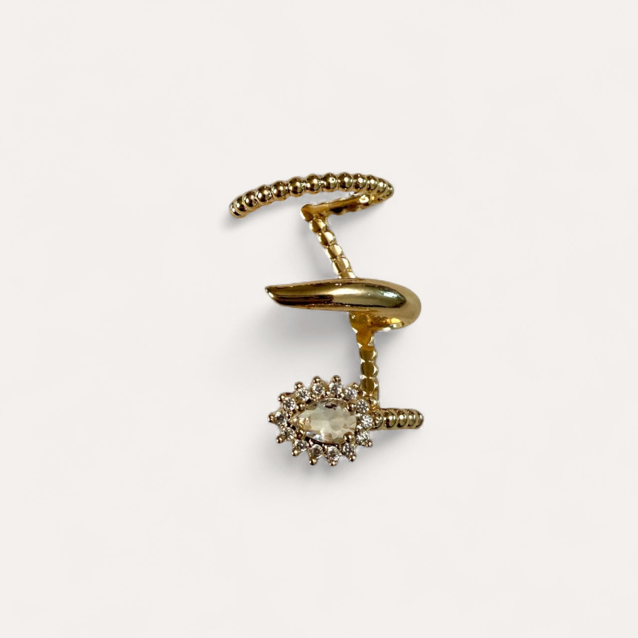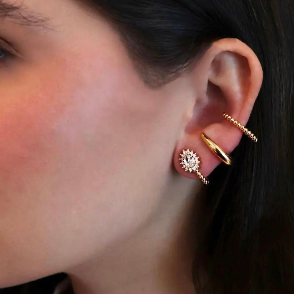 A radiant marquise-cut centerpiece encircled by golden orbs. Delicate yet bold like a sunburst at dusk.