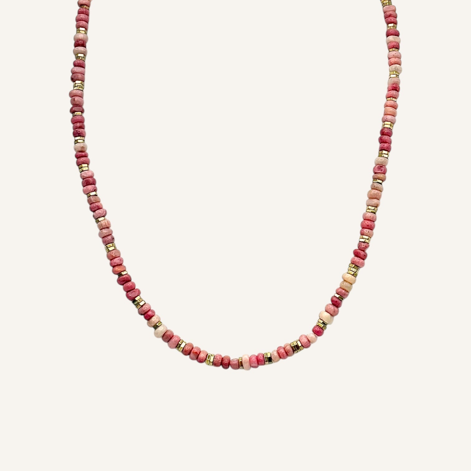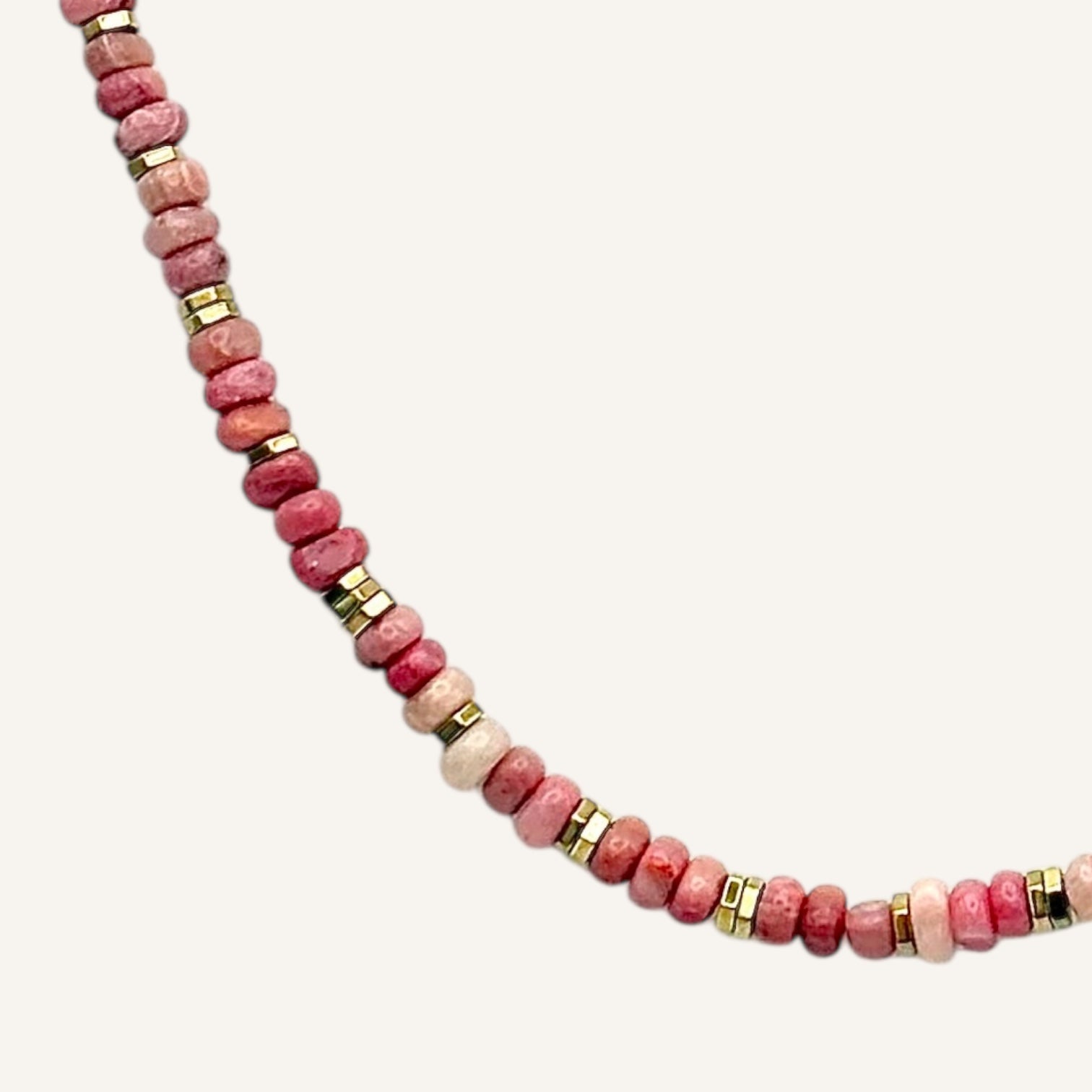 Delicate rose-toned beads create a soft, romantic look. A sweet pop of color for everyday layering.