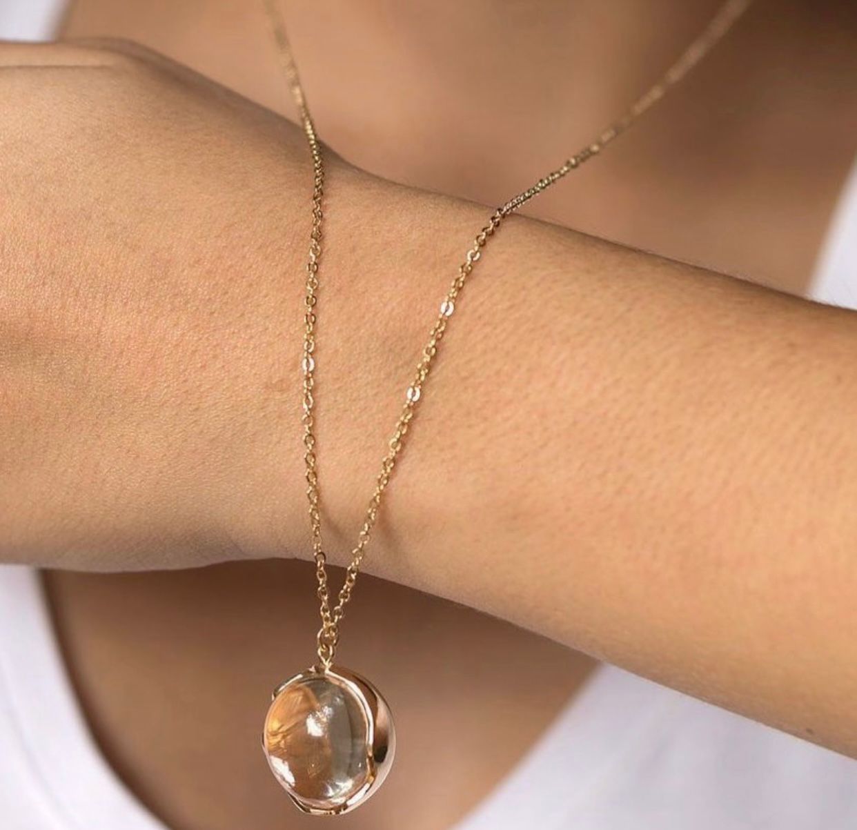 A round pendant necklace with soft golden tones and delicate etching. Refined, graceful, and timeless.
